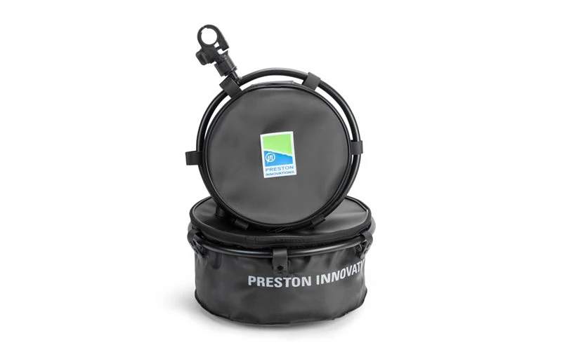 A waterproof EVA groundbait bowl with a rigid hoop, for attaching directly to seatbox or platform legs. Collapsible for easy storage and transportation. SnapLok for ease of transport and assembly.